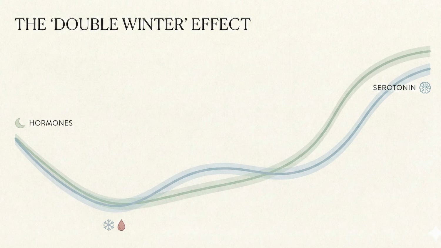 The Result: When you bleed during the dark winter months, you are navigating low estrogen, low progesterone, low serotonin, and high melatonin all at once. Your body isn't "giving up" on you; it is aggressively signaling you to hibernate.