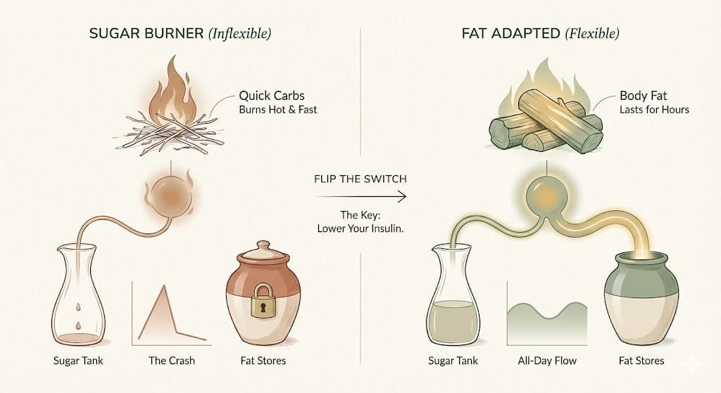 Metabolic Flexibility is the ability to switch seamlessly. You enjoy the kindling (brunch with friends), but when that runs out, your body effortlessly switches to burning the logs (your own energy stores) without you feeling a crash.